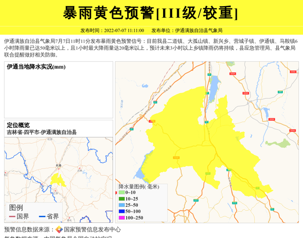 伊通满族自治县气象局7月7日11时11分发布暴雨黄色预警信号:目前我县二道镇、大孤山镇、新兴乡、营城子镇、伊通镇、马鞍镇6小时降雨量已达50毫米以上,且1小时最大降雨量达20毫米以上,预计未来3小时以上乡镇降雨仍将持续,县应急管理局、县气象局联合提醒做好相关防御。 信息来源:国家预警信息发布中心; 发布单位:伊通满族自治县气象局。