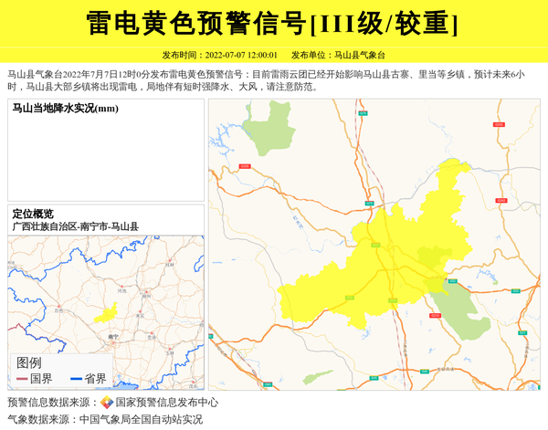 马山县气象台2022年7月7日12时0分发布雷电黄色预警信号:目前雷雨云团已经开始影响马山县古寨、里当等乡镇,预计未来6小时,马山县大部乡镇将出现雷电,局地伴有短时强降水、大风,请注意防范。 信息来源:国家预警信息发布中心; 发布单位:马山县气象台。