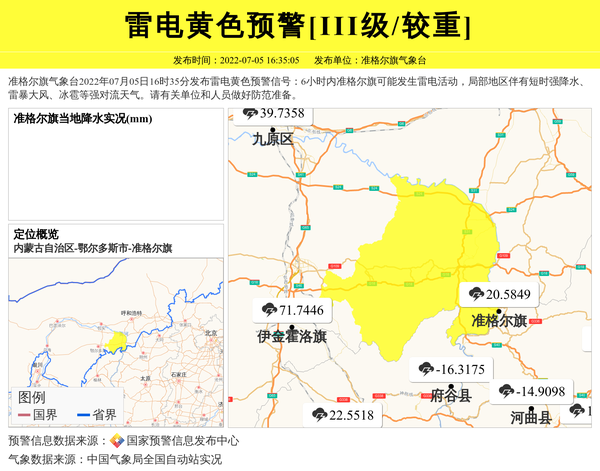 准格尔旗气象台2022年07月05日16时35分发布雷电黄色预警信号:6小时内准格尔旗可能发生雷电活动,局部地区伴有短时强降水、雷暴大风、冰雹等强对流天气。请有关单位和人员做好防范准备。 信息来源:国家预警信息发布中心; 发布单位:准格尔旗气象台。