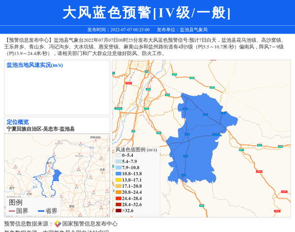 【预警信息发布中心】盐池县气象台2022年07月07日08时25分发布大风蓝色预警信号:预计7日白天,盐池县花马池镇、高沙窝镇、王乐井乡、青山乡、冯记沟乡、大水坑镇、惠安堡镇、麻黄山乡和盐州路街道有4到5级(约5.5~10.7米/秒)偏南风,阵风7~9级(约13.9~24.4米/秒),请相关部门和广大群众注意做好防风、防火工作。 信息来源:国家预警信息发布中心; 发布单位:盐池县气象局。