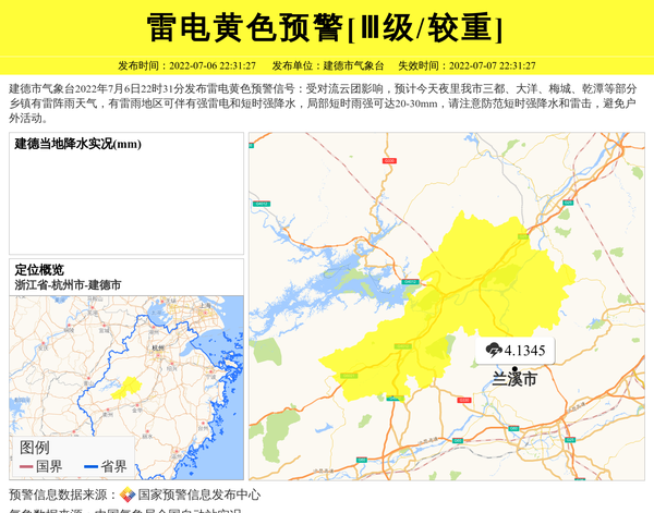建德市气象台2022年7月6日22时31分发布雷电黄色预警信号:受对流云团影响,预计今天夜里我市三都、大洋、梅城、乾潭等部分乡镇有雷阵雨天气,有雷雨地区可伴有强雷电和短时强降水,局部短时雨强可达20-30mm,请注意防范短时强降水和雷击,避免户外活动。 信息来源:国家预警信息发布中心; 发布单位:建德市气象台。