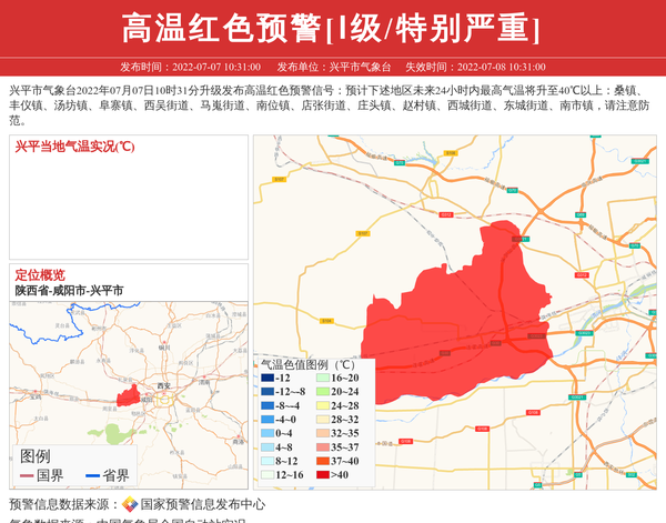兴平市气象台2022年07月07日10时31分升级发布高温红色预警信号:预计下述地区未来24小时内最高气温将升至40℃以上:桑镇、丰仪镇、汤坊镇、阜寨镇、西吴街道、马嵬街道、南位镇、店张街道、庄头镇、赵村镇、西城街道、东城街道、南市镇,请注意防范。 信息来源:国家预警信息发布中心; 发布单位:兴平市气象台。