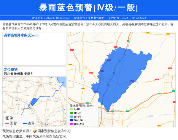 吴桥县气象台2022年07月05日22时11分发布暴雨蓝色预警信号:预计今天夜间到明天白天,吴桥县各乡镇降雨量将超过50毫米,请有关单位和人员做好防范准备。 信息来源:国家预警信息发布中心; 发布单位:吴桥县气象台。