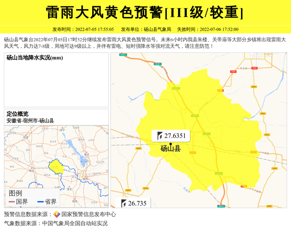 砀山县气象台2022年07月05日17时52分继续发布雷雨大风黄色预警信号。未来6小时内我县朱楼、关帝庙等大部分乡镇将出现雷雨大风天气,风力达7-8级,局地可达9级以上,并伴有雷电、短时强降水等强对流天气,请注意防范! 信息来源:国家预警信息发布中心; 发布单位:砀山县气象局。