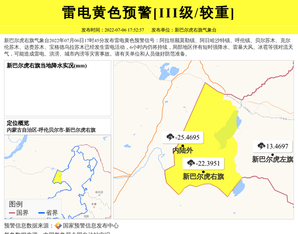 新巴尔虎右旗气象台2022年07月06日17时45分发布雷电黄色预警信号:阿拉坦额莫勒镇、阿日哈沙特镇、呼伦镇、贝尔苏木、克尔伦苏木、达赉苏木、宝格德乌拉苏木已经发生雷电活动,6小时内仍将持续,局部地区伴有短时强降水、雷暴大风、冰雹等强对流天气,可能造成雷电、洪涝、城市内涝等灾害事故。请有关单位和人员做好防范准备。 信息来源:国家预警信息发布中心; 发布单位:新巴尔虎右旗气象台。