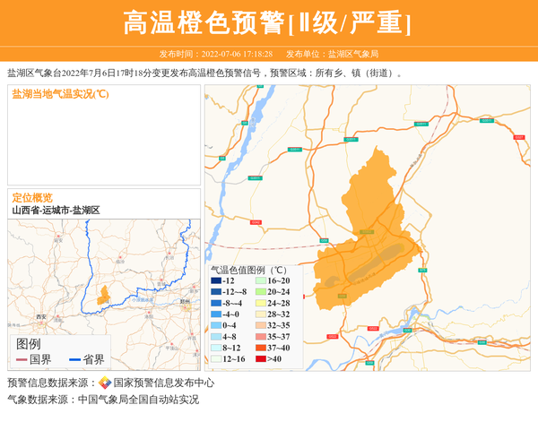 盐湖区气象台2022年7月6日17时18分变更发布高温橙色预警信号,预警区域:所有乡、镇(街道)。 信息来源:国家预警信息发布中心; 发布单位:盐湖区气象局。
