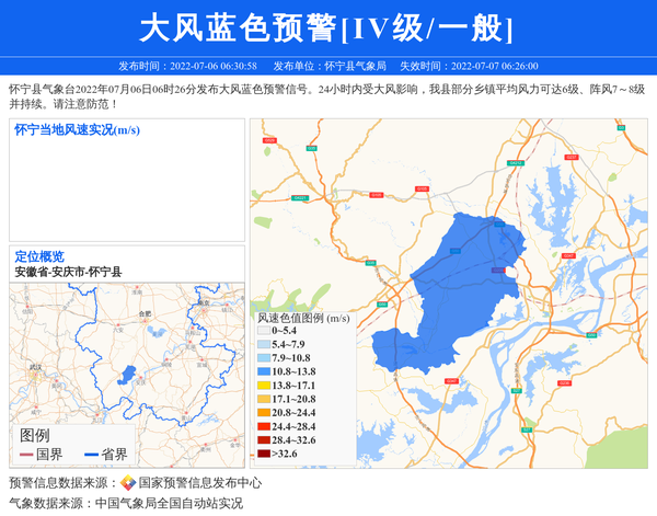 怀宁县气象台2022年07月06日06时26分发布大风蓝色预警信号。24小时内受大风影响,我县部分乡镇平均风力可达6级、阵风7~8级并持续。请注意防范! 信息来源:国家预警信息发布中心; 发布单位:怀宁县气象局。