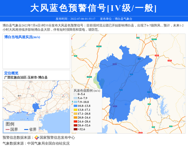 博白县气象台2022年7月6日1时55分发布大风蓝色预警信号:目前强对流云团已开始影响博白县,出现了6-7级阵风,预计,未来1-2小时大风将持续并影响博白县大部,伴有短时强降雨和雷电,请防范。 信息来源:国家预警信息发布中心; 发布单位:博白县气象台。
