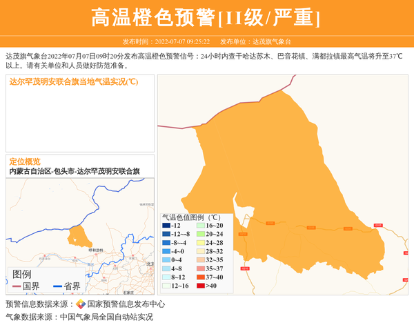 达茂旗气象台2022年07月07日09时20分发布高温橙色预警信号:24小时内查干哈达苏木、巴音花镇、满都拉镇最高气温将升至37℃以上。请有关单位和人员做好防范准备。 信息来源:国家预警信息发布中心; 发布单位:达茂旗气象台。