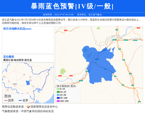 依兰县气象台2022年7月7日08时35分发布暴雨蓝色预警信号:预计未来12小时内,我县部分乡镇过程累计雨量将达50毫米或以上,且降雨可能持续,请有关单位和个人注意做好预防工作。 信息来源:国家预警信息发布中心; 发布单位:依兰县气象台。