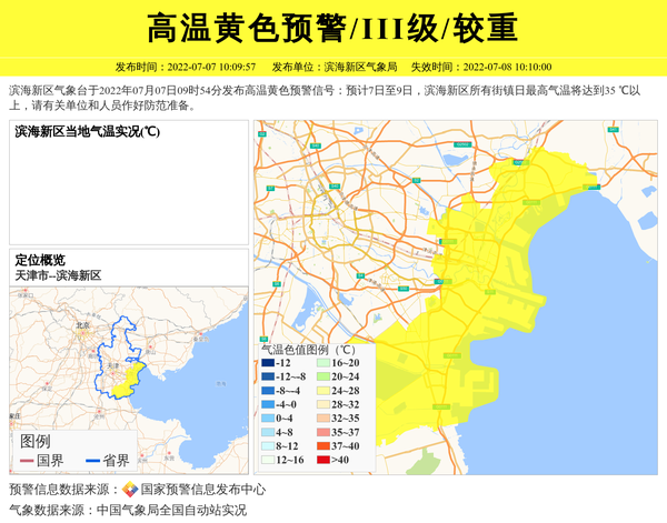 滨海新区气象台于2022年07月07日09时54分发布高温黄色预警信号:预计7日至9日,滨海新区所有街镇日最高气温将达到35 ℃以上,请有关单位和人员作好防范准备。 信息来源:国家预警信息发布中心; 发布单位:滨海新区气象局。