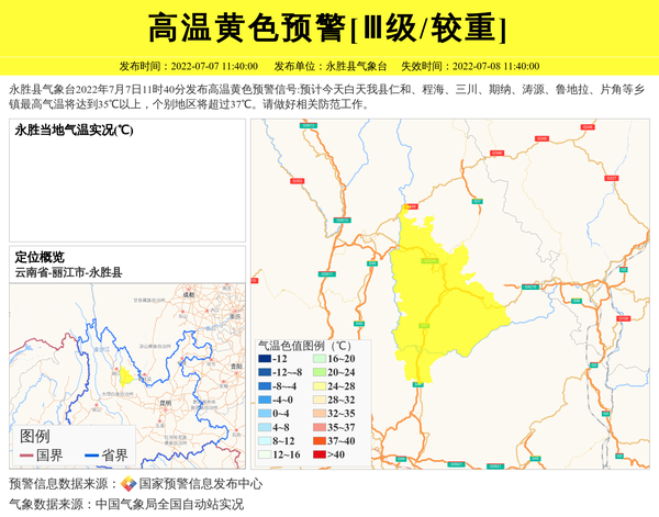 永胜县气象台2022年7月7日11时40分发布高温黄色预警信号:预计今天白天我县仁和、程海、三川、期纳、涛源、鲁地拉、片角等乡镇最高气温将达到35℃以上,个别地区将超过37℃。请做好相关防范工作。 信息来源:国家预警信息发布中心; 发布单位:永胜县气象台。