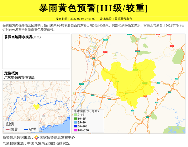 受英德方向强降雨云团影响,预计未来3小时我县自西向东将出现20到40毫米、局部40到60毫米降水,翁源县气象台于2022年7月6日07时19分发布全县暴雨黄色预警信号。 信息来源:国家预警信息发布中心; 发布单位:翁源县气象台。