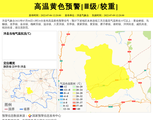 洋县气象台2022年07月06日12时28分发布高温黄色预警信号:预计下述地区未来连续三天日最高气温将在35℃以上:黄金峡镇、马畅镇、龙亭镇、金水镇、槐树关镇、溢水镇、八里关镇、关帝镇、黄家营镇、黄安镇、磨子桥镇、谢村镇、洋州街道、戚氏街道、纸坊街道,请注意防范。 信息来源:国家预警信息发布中心; 发布单位:洋县气象台。