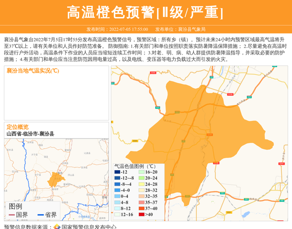 襄汾县气象台2022年7月5日17时55分发布高温橙色预警信号,预警区域:所有乡(镇)。预计未来24小时内预警区域最高气温将升至37℃以上,请有关单位和人员作好防范准备。 防御指南: 1.有关部门和单位按照职责落实防暑降温保障措施; 2.尽量避免在高温时段进行户外活动,高温条件下作业的人员应当缩短连续工作时间; 3.对老、弱、病、幼人群提供防暑降温指导,并采取必要的防护措施; 4.有关部门和单位应当注意防范因用电量过高,以及电线、变压器等电力负载过大而引发的火灾。 信息来源:国家预警信息发布中心; 发布单位:襄汾县气象局。