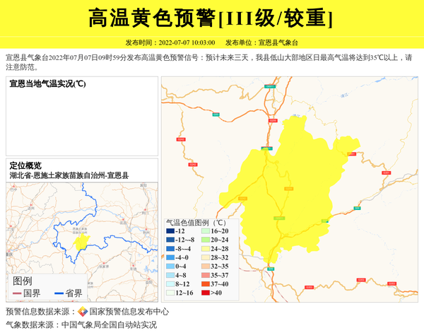 宣恩县气象台2022年07月07日09时59分发布高温黄色预警信号:预计未来三天,我县低山大部地区日最高气温将达到35℃以上,请注意防范。 信息来源:国家预警信息发布中心; 发布单位:宣恩县气象台。