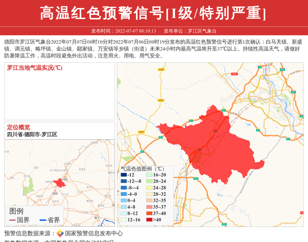 德阳市罗江区气象台2022年07月07日08时10分对2022年07月06日08时19分发布的高温红色预警信号进行第1次确认:白马关镇、新盛镇、调元镇、略坪镇、金山镇、鄢家镇、万安镇等乡镇(街道)未来24小时内最高气温将升至37℃以上。持续性高温天气,请做好防暑降温工作,高温时段避免外出活动,注意用火、用电、用气安全。 信息来源:国家预警信息发布中心; 发布单位:罗江区气象台。