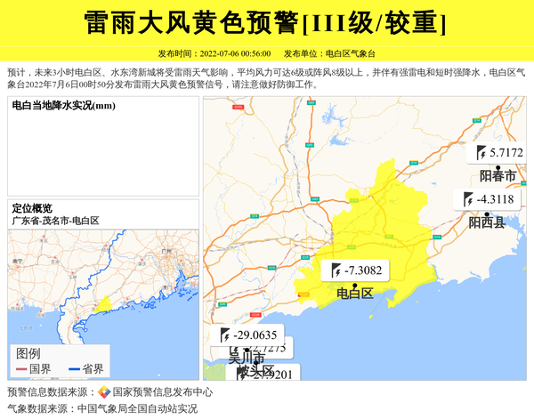 预计,未来3小时电白区、水东湾新城将受雷雨天气影响,平均风力可达6级或阵风8级以上,并伴有强雷电和短时强降水,电白区气象台2022年7月6日00时50分发布雷雨大风黄色预警信号,请注意做好防御工作。 信息来源:国家预警信息发布中心; 发布单位:电白区气象台。
