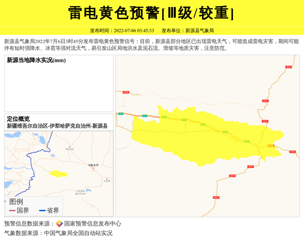 新源县气象局2022年7月6日3时45分发布雷电黄色预警信号:目前,新源县部分地区已出现雷电天气,可能造成雷电灾害,期间可能伴有短时强降水、冰雹等强对流天气,易引发山区局地洪水及泥石流、滑坡等地质灾害,注意防范。 信息来源:国家预警信息发布中心; 发布单位:新源县气象局。