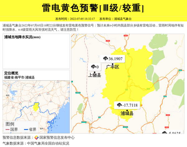 浦城县气象台2022年07月05日18时22分继续发布雷电黄色预警信号:预计未来6小时内我县部分乡镇有雷电活动,雷雨时局地伴有短时强降水、6-8级雷雨大风等强对流天气,请注意防范! 信息来源:国家预警信息发布中心; 发布单位:浦城县气象台。