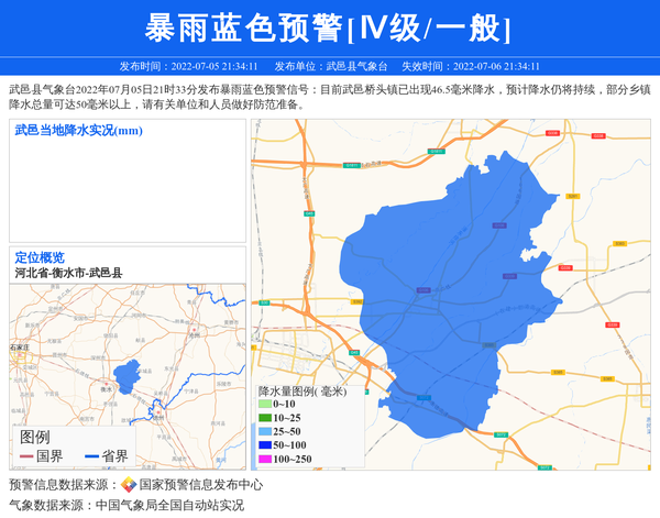 武邑县气象台2022年07月05日21时33分发布暴雨蓝色预警信号:目前武邑桥头镇已出现46.5毫米降水,预计降水仍将持续,部分乡镇降水总量可达50毫米以上,请有关单位和人员做好防范准备。 信息来源:国家预警信息发布中心; 发布单位:武邑县气象台。