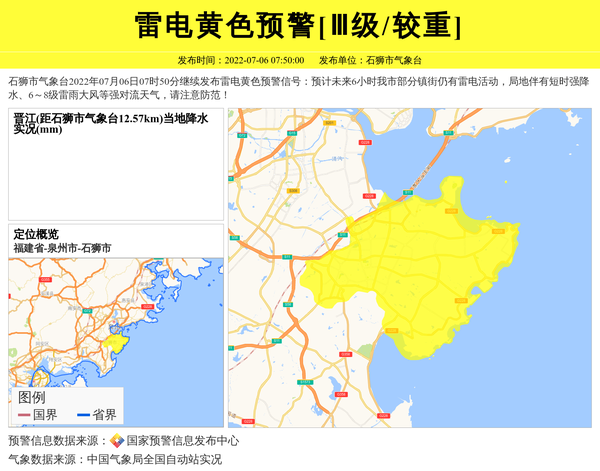 石狮市气象台2022年07月06日07时50分继续发布雷电黄色预警信号:预计未来6小时我市部分镇街仍有雷电活动,局地伴有短时强降水、6~8级雷雨大风等强对流天气,请注意防范! 信息来源:国家预警信息发布中心; 发布单位:石狮市气象台。