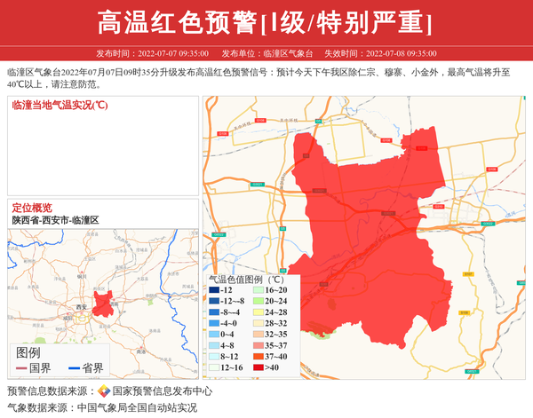 临潼区气象台2022年07月07日09时35分升级发布高温红色预警信号:预计今天下午我区除仁宗、穆寨、小金外,最高气温将升至40℃以上,请注意防范。 信息来源:国家预警信息发布中心; 发布单位:临潼区气象台。