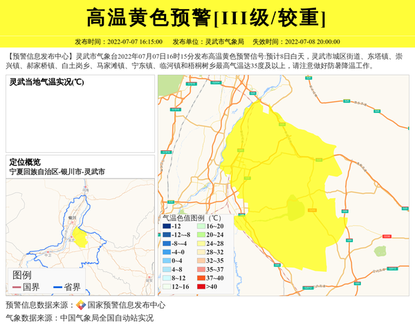 【预警信息发布中心】灵武市气象台2022年07月07日16时15分发布高温黄色预警信号:预计8日白天,灵武市城区街道、东塔镇、崇兴镇、郝家桥镇、白土岗乡、马家滩镇、宁东镇、临河镇和梧桐树乡最高气温达35度及以上,请注意做好防暑降温工作。 信息来源:国家预警信息发布中心; 发布单位:灵武市气象局。
