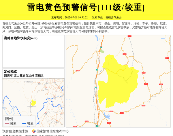 喜德县气象台2022年07月08日16时56分发布雷电黄色预警信号:预计我县米市、冕山、光明、贺波洛、洛哈、李子、鲁基、尼波、两河口、且拖、红莫、北山、沙马拉达等乡镇6小时内可能发生雷电活动,可能会造成雷电灾害事故,局部地方还可能伴有阵性大风、冰雹和短时强降水等灾害性天气,请注意防范灾害性天气可能带来的不利影响。 信息来源:国家预警信息发布中心; 发布单位:喜德县气象台。