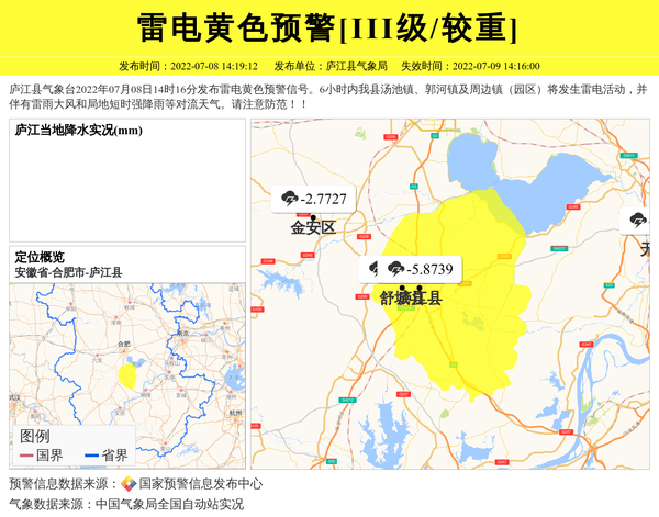 庐江县气象台2022年07月08日14时16分发布雷电黄色预警信号。6小时内我县汤池镇、郭河镇及周边镇(园区)将发生雷电活动,并伴有雷雨大风和局地短时强降雨等对流天气。请注意防范!! 信息来源:国家预警信息发布中心; 发布单位:庐江县气象局。