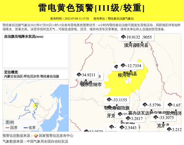 鄂伦春自治旗气象台2022年07月08日11时15分发布雷电黄色预警信号:6小时内鄂伦春自治旗可能发生雷电活动,局部地区伴有短时强降水、雷暴大风、冰雹等强对流天气,可能造成雷电、洪涝、城市内涝等灾害事故。请有关单位和人员做好防范准备。 信息来源:国家预警信息发布中心; 发布单位:鄂伦春自治旗气象台。