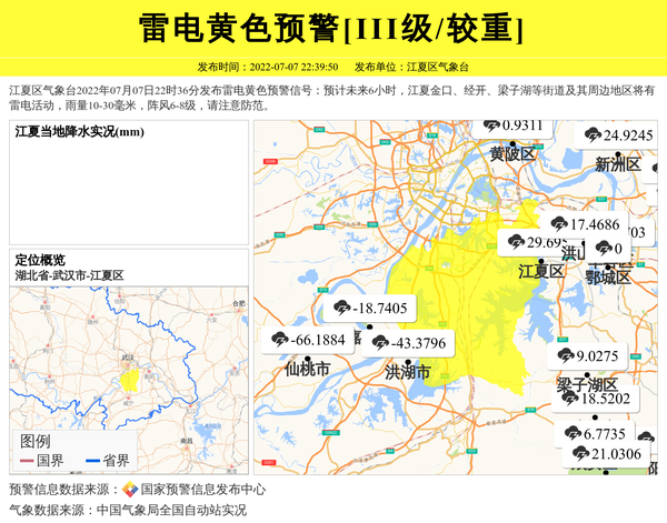 江夏区气象台2022年07月07日22时36分发布雷电黄色预警信号:预计未来6小时,江夏金口、经开、梁子湖等街道及其周边地区将有雷电活动,雨量10-30毫米,阵风6-8级,请注意防范。 信息来源:国家预警信息发布中心; 发布单位:江夏区气象台。