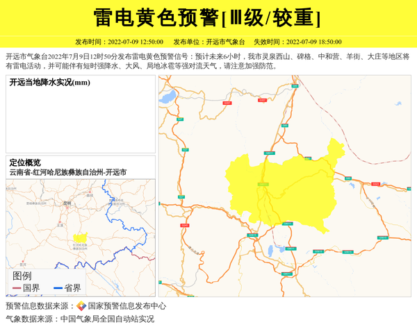 开远市气象台2022年7月9日12时50分发布雷电黄色预警信号:预计未来6小时,我市灵泉西山、碑格、中和营、羊街、大庄等地区将有雷电活动,并可能伴有短时强降水、大风、局地冰雹等强对流天气,请注意加强防范。 信息来源:国家预警信息发布中心; 发布单位:开远市气象台。