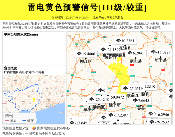 平南县气象台2022年7月8日14时26分发布雷电黄色预警信号:目前雷雨云团正从桂平逐渐靠近平南,并向东偏北方向移动,预计未来6小时平南县大部乡镇将发生雷电活动,可能会造成雷电灾害事故,并伴有短时强降水、大风等强对流天气,请做好防范。 信息来源:国家预警信息发布中心; 发布单位:平南县气象台。