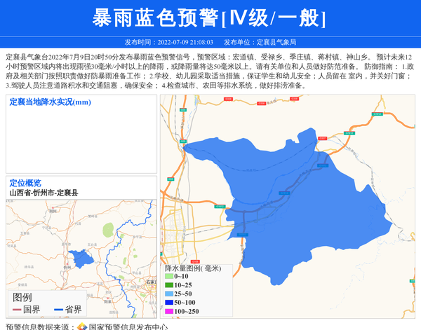 定襄县气象台2022年7月9日20时50分发布暴雨蓝色预警信号,预警区域:宏道镇、受禄乡、季庄镇、蒋村镇、神山乡。 预计未来12小时预警区域内将出现雨强30毫米/小时以上的降雨,或降雨量将达50毫米以上。请有关单位和人员做好防范准备。 防御指南: 1.政府及相关部门按照职责做好防暴雨准备工作; 2.学校、幼儿园采取适当措施,保证学生和幼儿安全;人员留在 室内,并关好门窗; 3.驾驶人员注意道路积水和交通阻塞,确保安全; 4.检查城市、农田等排水系统,做好排涝准备。 信息来源:国家预警信息发布中心; 发布单位:定襄县气象局。