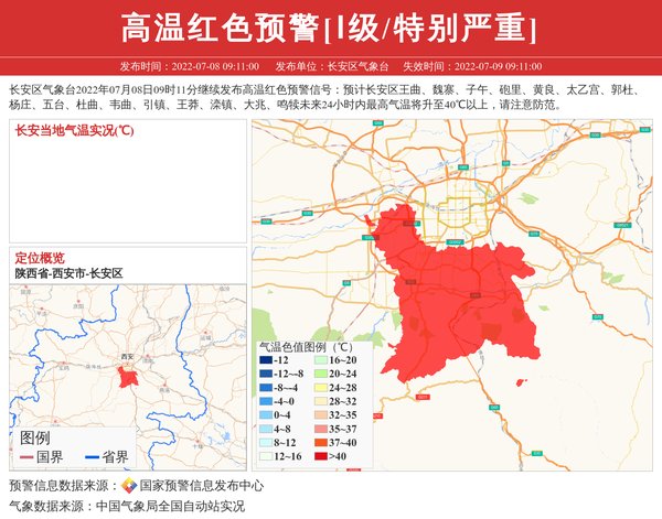 长安区气象台2022年07月08日09时11分继续发布高温红色预警信号:预计长安区王曲、魏寨、子午、砲里、黄良、太乙宫、郭杜、杨庄、五台、杜曲、韦曲、引镇、王莽、滦镇、大兆、鸣犊未来24小时内最高气温将升至40℃以上,请注意防范。 信息来源:国家预警信息发布中心; 发布单位:长安区气象台。