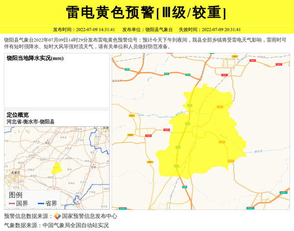 饶阳县气象台2022年07月09日14时29分发布雷电黄色预警信号:预计今天下午到夜间,我县全部乡镇将受雷电天气影响,雷雨时可伴有短时强降水、短时大风等强对流天气,请有关单位和人员做好防范准备。 信息来源:国家预警信息发布中心; 发布单位:饶阳县气象台。