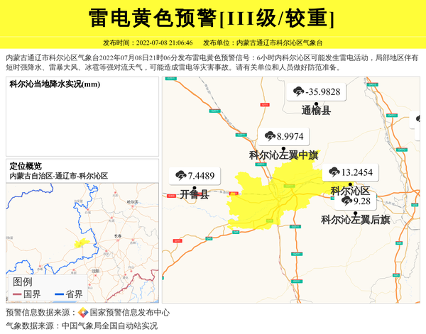 内蒙古通辽市科尔沁区气象台2022年07月08日21时06分发布雷电黄色预警信号:6小时内科尔沁区可能发生雷电活动,局部地区伴有短时强降水、雷暴大风、冰雹等强对流天气,可能造成雷电等灾害事故。请有关单位和人员做好防范准备。 信息来源:国家预警信息发布中心; 发布单位:内蒙古通辽市科尔沁区气象台。