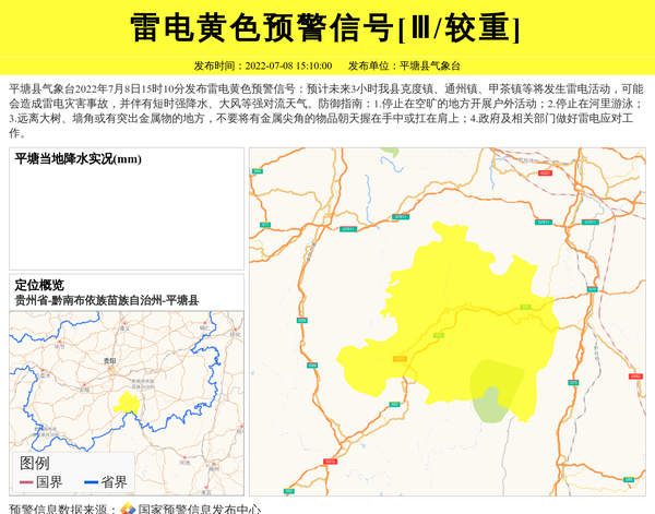 平塘县气象台2022年7月8日15时10分发布雷电黄色预警信号:预计未来3小时我县克度镇、通州镇、甲茶镇等将发生雷电活动,可能会造成雷电灾害事故,并伴有短时强降水、大风等强对流天气。防御指南:1.停止在空旷的地方开展户外活动;2.停止在河里游泳;3.远离大树、墙角或有突出金属物的地方,不要将有金属尖角的物品朝天握在手中或扛在肩上;4.政府及相关部门做好雷电应对工作。 信息来源:国家预警信息发布中心; 发布单位:平塘县气象台。
