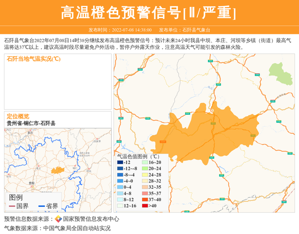 石阡县气象台2022年07月08日14时38分继续发布高温橙色预警信号:预计未来24小时我县中坝、本庄、河坝等乡镇(街道)最高气温将达37℃以上,建议高温时段尽量避免户外活动,暂停户外露天作业,注意高温天气可能引发的森林火险。 信息来源:国家预警信息发布中心; 发布单位:石阡县气象台。