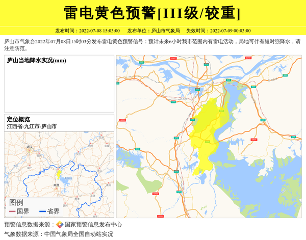 庐山市气象台2022年07月08日15时03分发布雷电黄色预警信号:预计未来6小时我市范围内有雷电活动,局地可伴有短时强降水,请注意防范。 信息来源:国家预警信息发布中心; 发布单位:庐山市气象局。