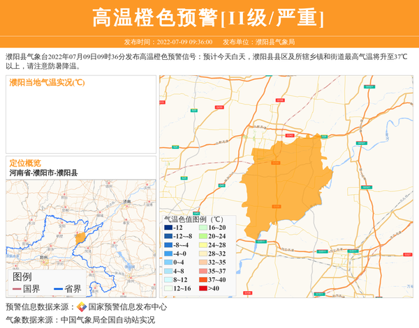 濮阳县气象台2022年07月09日09时36分发布高温橙色预警信号:预计今天白天,濮阳县县区及所辖乡镇和街道最高气温将升至37℃以上,请注意防暑降温。 信息来源:国家预警信息发布中心; 发布单位:濮阳县气象局。