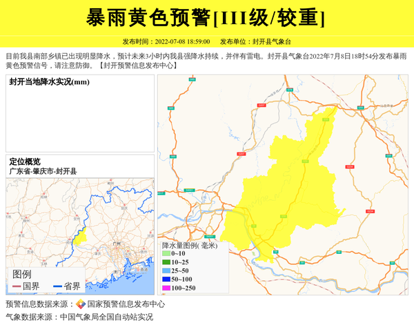 目前我县南部乡镇已出现明显降水,预计未来3小时内我县强降水持续,并伴有雷电。封开县气象台2022年7月8日18时54分发布暴雨黄色预警信号,请注意防御。【封开预警信息发布中心】 信息来源:国家预警信息发布中心; 发布单位:封开县气象台。