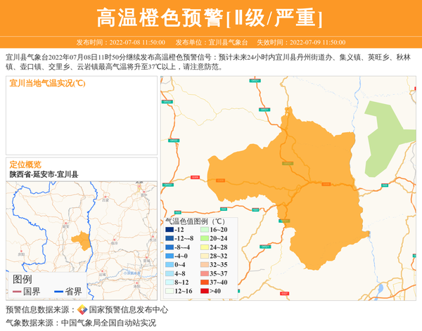宜川县气象台2022年07月08日11时50分继续发布高温橙色预警信号:预计未来24小时内宜川县丹州街道办、集义镇、英旺乡、秋林镇、壶口镇、交里乡、云岩镇最高气温将升至37℃以上,请注意防范。 信息来源:国家预警信息发布中心; 发布单位:宜川县气象台。