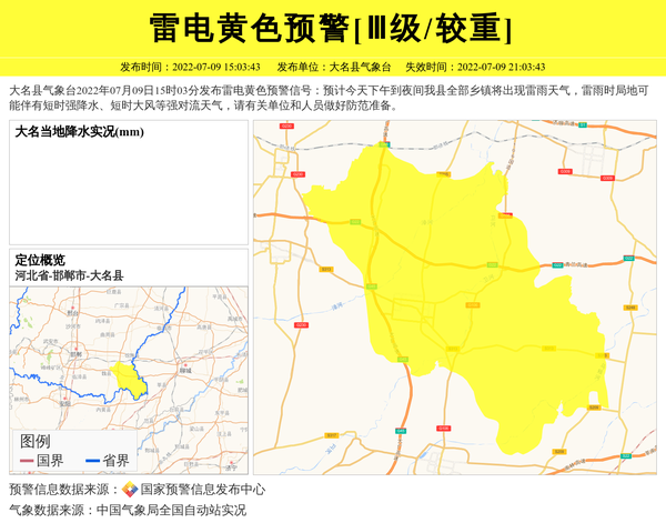 大名县气象台2022年07月09日15时03分发布雷电黄色预警信号:预计今天下午到夜间我县全部乡镇将出现雷雨天气,雷雨时局地可能伴有短时强降水、短时大风等强对流天气,请有关单位和人员做好防范准备。 信息来源:国家预警信息发布中心; 发布单位:大名县气象台。