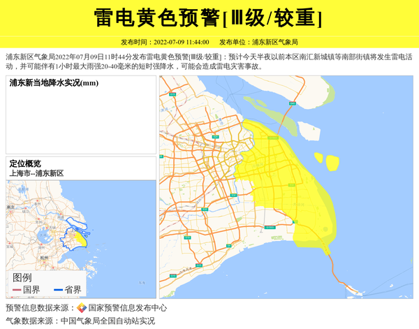 浦东新区气象局2022年07月09日11时44分发布雷电黄色预警[Ⅲ级/较重]:预计今天半夜以前本区南汇新城镇等南部街镇将发生雷电活动,并可能伴有1小时最大雨强20-40毫米的短时强降水,可能会造成雷电灾害事故。 信息来源:国家预警信息发布中心; 发布单位:浦东新区气象局。