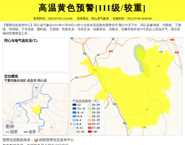 【预警信息发布中心】同心县气象台2022年07月09日13时21分发布高温黄色预警信号:预计今天下午,同心县豫海镇、河西镇、丁塘镇、韦州镇、下马关镇、预旺镇、王团镇、田老庄乡、马高庄乡、张家塬乡、兴隆乡、石狮开发区有35℃及以上高温天气,请注意做好防暑降温工作。 信息来源:国家预警信息发布中心; 发布单位:同心县气象局。