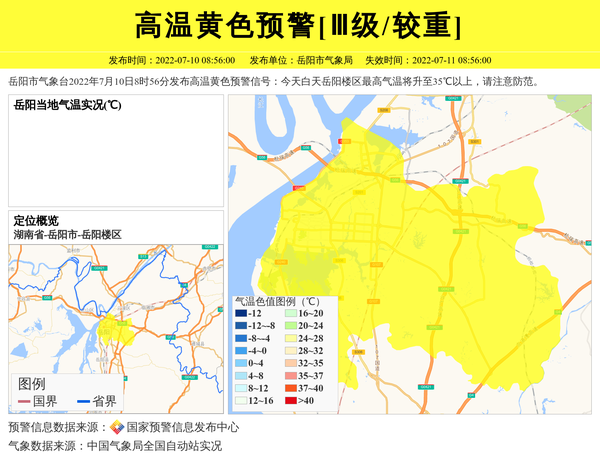 岳阳市气象台2022年7月10日8时56分发布高温黄色预警信号:今天白天岳阳楼区最高气温将升至35℃以上,请注意防范。 信息来源:国家预警信息发布中心; 发布单位:岳阳市气象局。