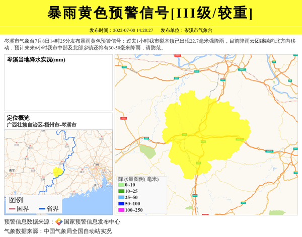 岑溪市气象台7月8日14时25分发布暴雨黄色预警信号:过去1小时我市梨木镇已出现22.7毫米强降雨,目前降雨云团继续向北方向移动,预计未来6小时我市中部及北部乡镇还将有30-50毫米降雨,请防范。 信息来源:国家预警信息发布中心; 发布单位:岑溪市气象台。