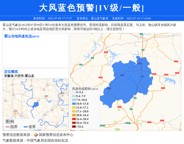 霍山县气象台2022年07月09日17时10分发布大风蓝色预警信号。受强对流影响,目前我县黑石渡、与儿街、衡山镇等乡镇风力较大,预计24小时内上述乡镇及周边地区受大风影响,阵风可能达到7级以上,请注意防范! 信息来源:国家预警信息发布中心; 发布单位:霍山县气象局。